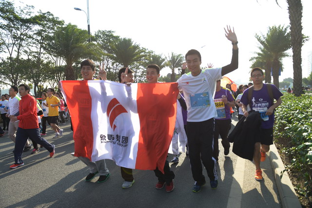 盡管冬日清晨有些凍人,但這絲毫沒有“凍”壞象嶼人的熱情。一進(jìn)入賽場,大家就摩拳擦掌,躍躍欲試。今年的馬拉松對象嶼跑團(tuán)而言,有著特殊的意義,這不僅是一場健康跑,更是一場公益跑。此次比賽跑道恰好與火燒嶼隔海相望,由集團(tuán)捐資建立的中華白海豚救護(hù)繁育基地正坐落島上。白海豚的可愛形象也隨之出現(xiàn)在象嶼“跑男”“跑女”的前胸、后背。公益旗幟、白海豚公益宣傳貼紙,紅帆logo,以及我們朝氣蓬勃的象嶼跑團(tuán)組成了一道“有愛”的風(fēng)景線。這也吸引了周圍許多馬拉松參賽者的目光,有的參賽者甚至圍上前來詢問是否也能加入其中。于是,象嶼救助白海豚的公益之舉隨著象嶼人的奔跑也一路傳播開來。