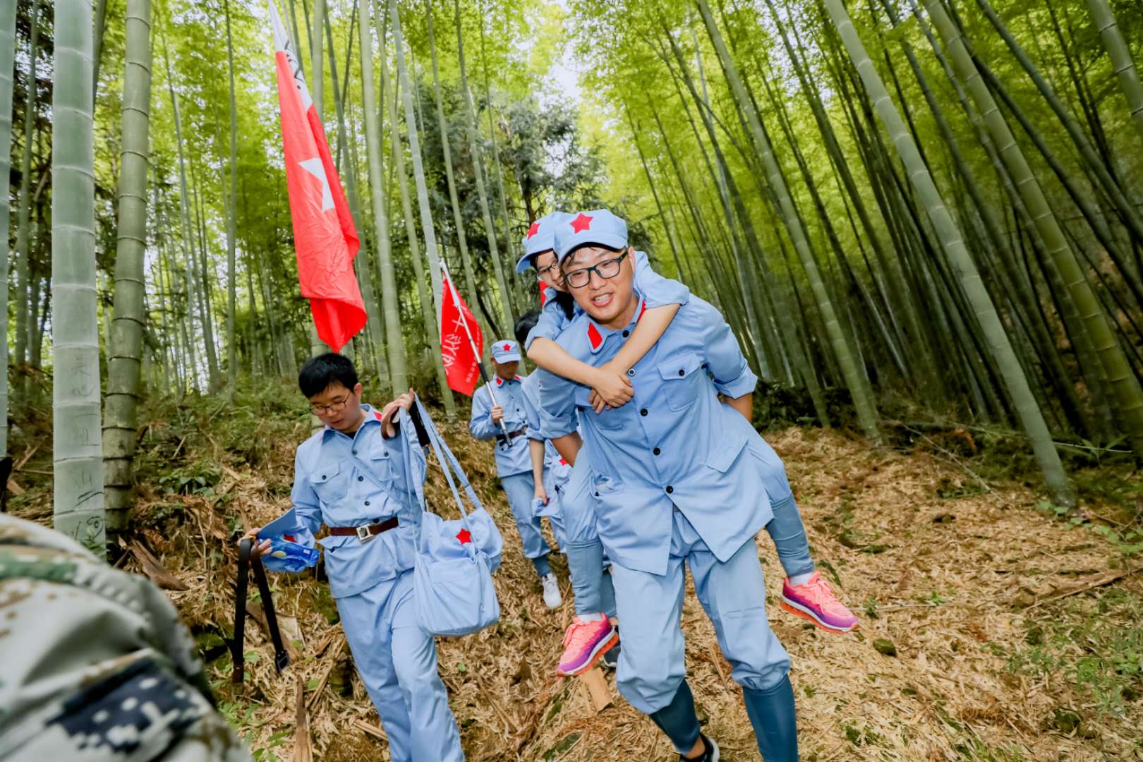 一路上,有的隊員見伙伴體力不支,便主動背起隊友在泥濘的小路上前行;還有些隊員為了振奮士氣、活躍氣氛,不停地奔波于隊伍的兩頭,鼓勵落后的隊員,唱起紅歌、踏著拍子,帶領(lǐng)隊員昂揚(yáng)前行。最終,全員均在規(guī)定時間內(nèi)挑戰(zhàn)成功,一個都不少!