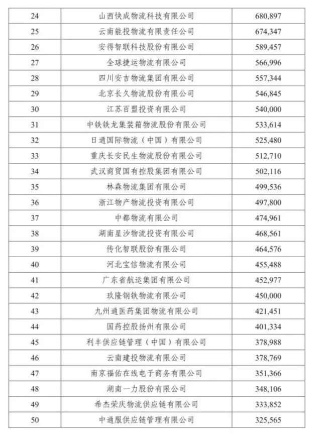 該榜單由中國物流與采購聯(lián)合會(huì)組織評(píng)選,按照重點(diǎn)物流企業(yè)統(tǒng)計(jì)調(diào)查結(jié)果提出了2019年度中國物流企業(yè)50強(qiáng)排名。據(jù)悉, 50強(qiáng)物流企業(yè)2018年物流業(yè)務(wù)收入合計(jì)9833億元,按可比口徑計(jì)算,同比增長(zhǎng)16.9%。50強(qiáng)物流企業(yè)門檻提高到32.6億元,比上年增加3億元。
