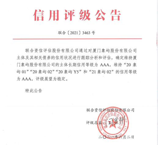 6月2日,權(quán)威評(píng)級(jí)機(jī)構(gòu)聯(lián)合資信評(píng)估股份有限公司(以下簡(jiǎn)稱(chēng)“聯(lián)合資信”)出具《廈門(mén)象嶼股份有限公司公開(kāi)發(fā)行公司債券2021年跟蹤評(píng)級(jí)報(bào)告》,維持