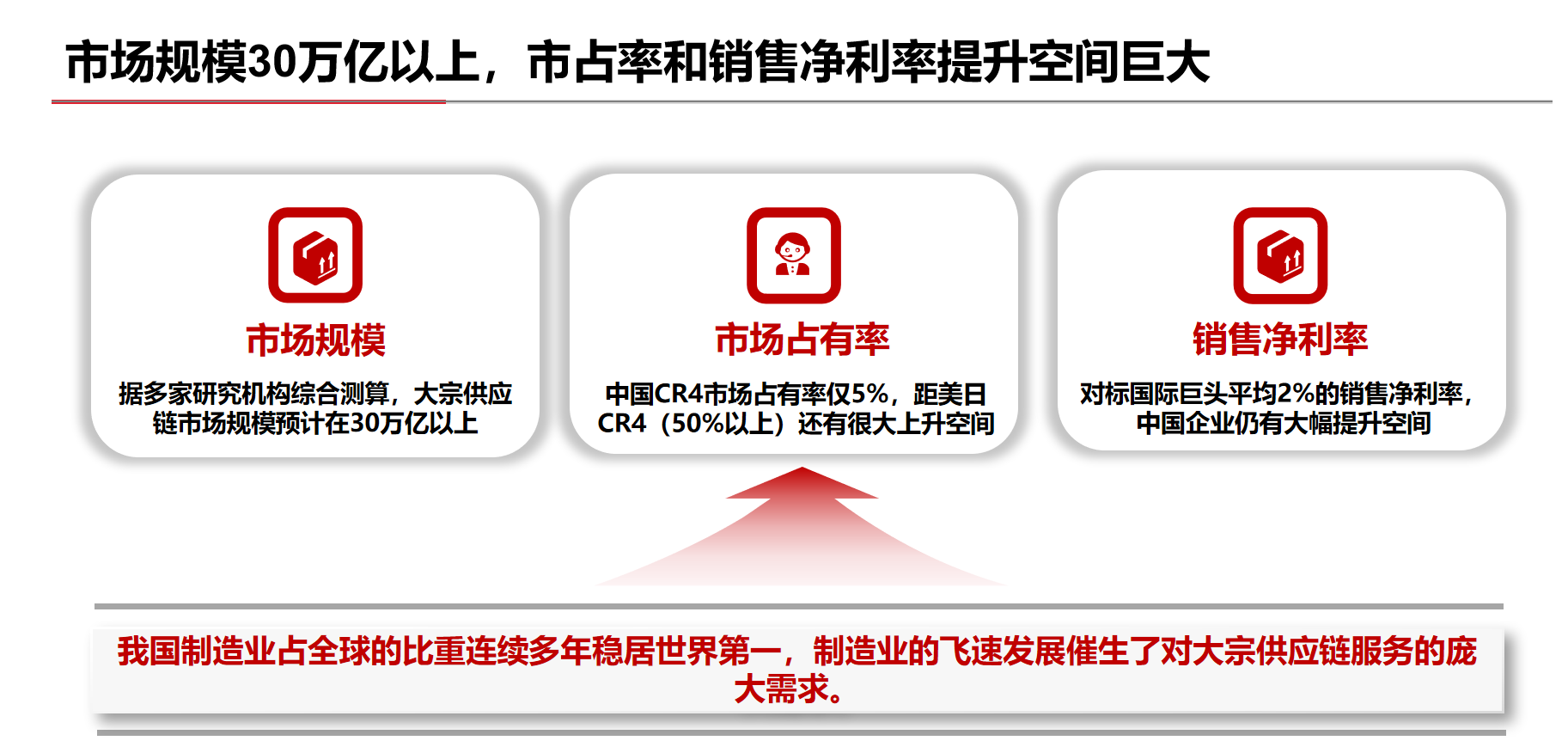 制造業(yè)企業(yè)日益專業(yè)化,對(duì)供應(yīng)鏈服務(wù)的需求從簡(jiǎn)單追求成本,轉(zhuǎn)變?yōu)楦非笮剩袌?chǎng)亟需能提供“一攬子”服務(wù)、具備效率優(yōu)勢(shì)的大宗供應(yīng)鏈服務(wù)商。