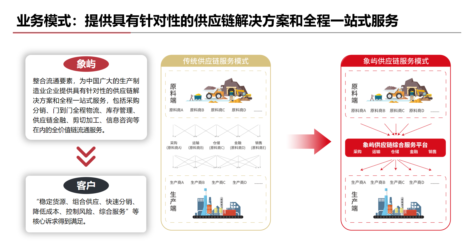 豐富多元、成熟穩(wěn)定的全球化業(yè)務(wù)渠道體系;覆蓋全國(guó)、連接海外的網(wǎng)絡(luò)化物流服務(wù)體系;正在構(gòu)建、初步成型的智能化信息科技體系;準(zhǔn)確識(shí)別、日趨完善的全面風(fēng)險(xiǎn)管控體系;市場(chǎng)化、專業(yè)化的供應(yīng)鏈服務(wù)團(tuán)隊(duì)。