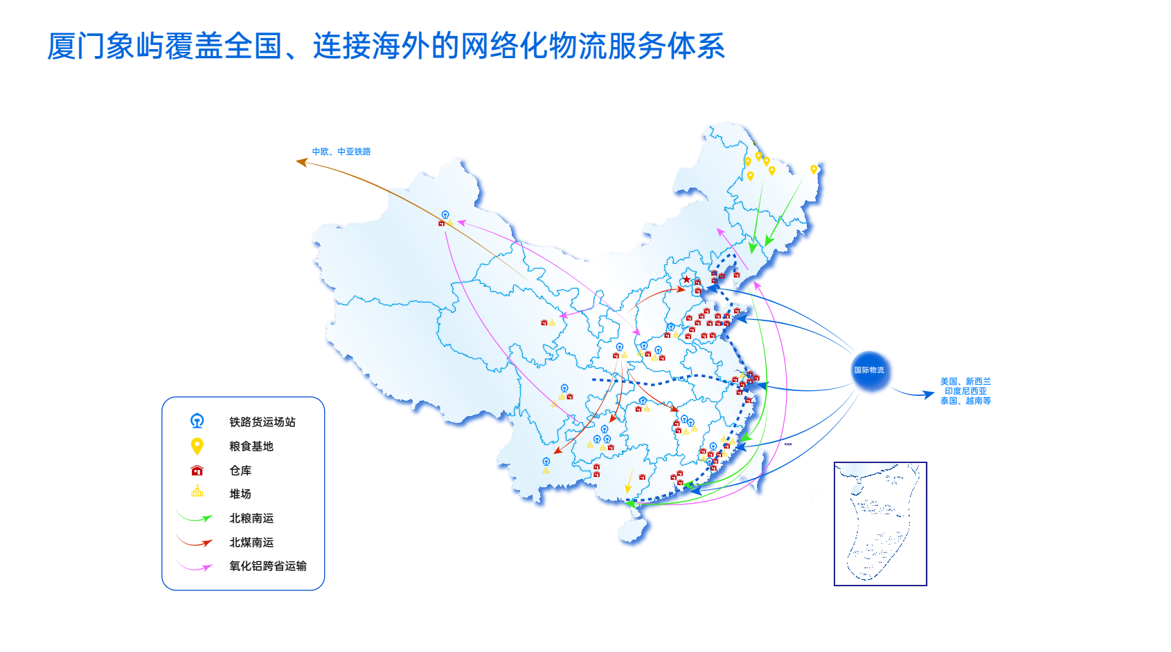 截至2021年底,象嶼股份在中西部及東部沿海布局自營倉儲節(jié)點40余個,倉容能力約300萬噸,合作倉庫超2500家,服務(wù)產(chǎn)品涵蓋化工、橡塑、農(nóng)產(chǎn)品、鋼鐵、木材、漿紙等。在東北及中西部地區(qū)大宗商品集散區(qū)域承接散糧、煤炭、氧化鋁等大宗商品運(yùn)輸任務(wù),已形成貫通中西、串聯(lián)南北的國內(nèi)鐵路運(yùn)輸通道及網(wǎng)絡(luò)。配套自有及租賃鐵路貨運(yùn)場站20個、擁有集裝箱堆場和倉庫逾250萬平方米,自備集裝箱2.6萬個,年均鐵路運(yùn)輸網(wǎng)絡(luò)發(fā)運(yùn)能力超1600萬噸,居行業(yè)前列,形成“山東、河南—新疆”“陜西—云貴川”等優(yōu)質(zhì)煤炭、鋁產(chǎn)品運(yùn)輸線路。